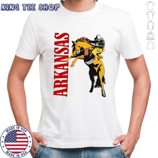 The design features a majestic horse galloping across the plains, with a cowboy hat hanging off the saddle, exuding a sense of adventure and freedom. The vintage-inspired graphics capture the essence of the cowboy lifestyle, making it a perfect choice for rodeos, country music festivals, or simply adding a touch of Western charm to your everyday wardrobe. Slip into this shirt and feel the pride of the Arkansas spirit coursing through your veins, connecting you to the rugged beauty and untamed soul of the American South. Embrace your inner cowboy with this timeless piece that blends nostalgia with modern style effortlessly.