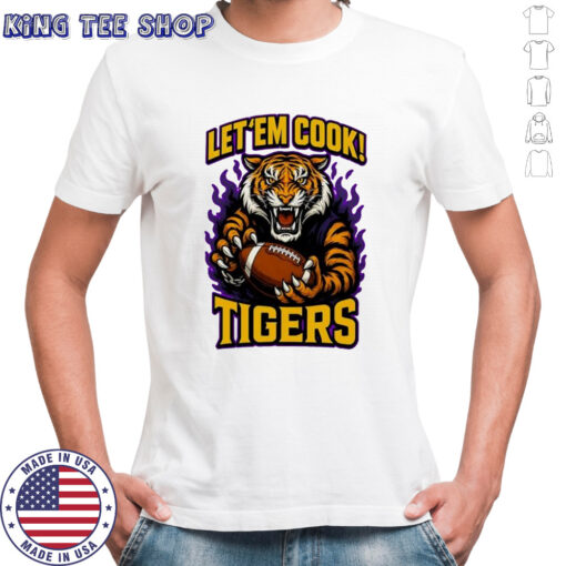 This **Let’em Cook Tigers Bold Let’Em Cook Tigers Football shirt** is not just a piece of clothing; it’s a statement, a symbol of unwavering team spirit and unbridled passion for the game. Picture yourself clad in this shirt, the vibrant colors and fierce tiger emblem exuding power and determination. It’s not just a shirt; it’s your armor, your badge of honor as you stand tall, ready to conquer any challenge that comes your way.