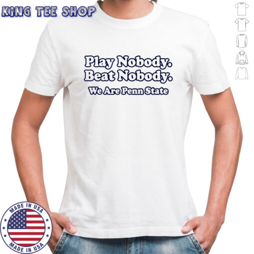 Embrace the spirit of Penn State with this Patrick W. Cutler Play Nobody Beat Nobody We Are Penn State t-shirt. Join the ranks of proud fans who wear their colors with joy and confidence. Make a statement, spark conversations, and relive the excitement of Penn State wherever you go. Pick yours today and let the world know – nobody beats a Nittany Lion!
