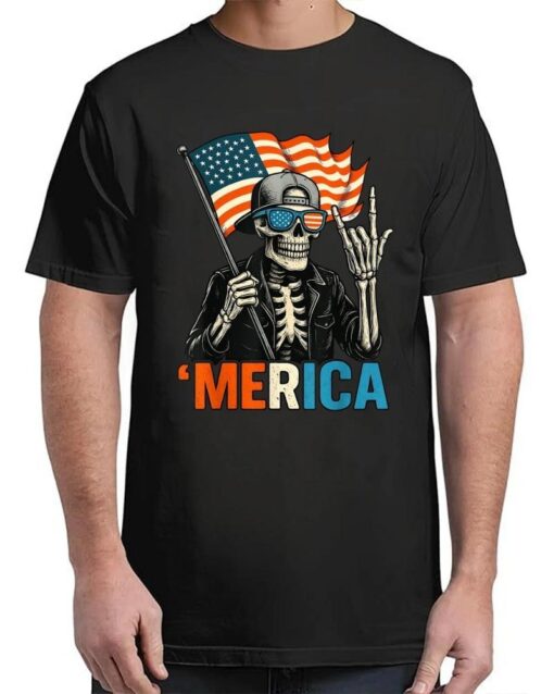 Skeleton Merica Rock American Flag Patriotic USA 4th Of July T-Shirt, hoodie, sweater, longsleeve and ladies t-shirt