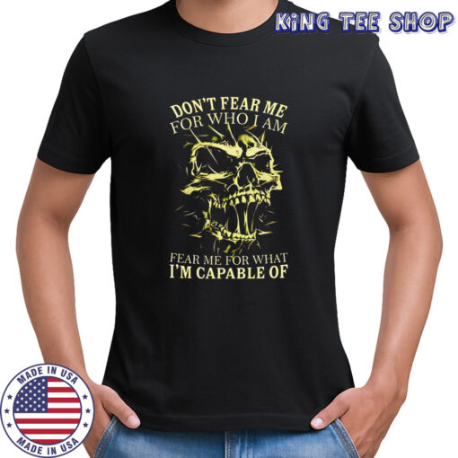 The edgy vibe of the **Skull don’t fear me for who i am fear me for what i’m capable of shirt** makes it perfect for those who embrace their uniqueness and stand unapologetically in their truth. Picture yourself donning this shirt at a music festival, a rebellious night out with friends, or simply as a daily reminder of your untapped potential. Let this shirt be your armor, your reminder that beneath the surface lies a force to be reckoned with. Embrace the fearless energy it embodies and step into each day with confidence. Embrace the fearlessness within you and let it shine through with this empowering garment.