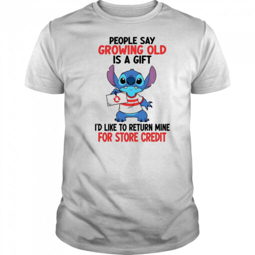 Stitch people say growing old is a gift i’d like to return mine for credit shirt