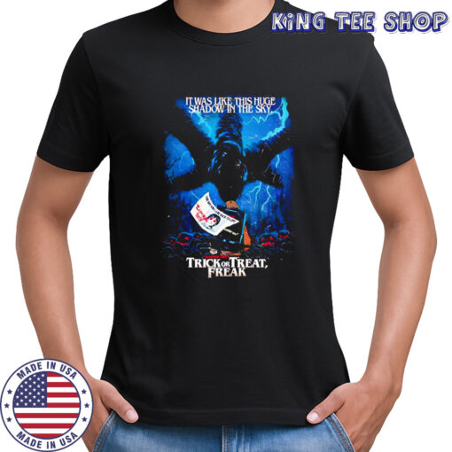 This **Stranger Things Season 2 x Butcher Billy The Trick or Treat Freak it was like the this huge shadow in the sky shirt** is a wearable masterpiece that encapsulates the essence of eerie nostalgia and quirky charm. Imagine stepping into the Upside Down world as you don this shirt, with its bold graphics and vibrant colors bringing to life the fusion of retro vibes and contemporary cool. The design, a brilliant collaboration between the hit series and the iconic artist, Butcher Billy, transports you to a realm where every corner holds a mystery waiting to be unraveled.