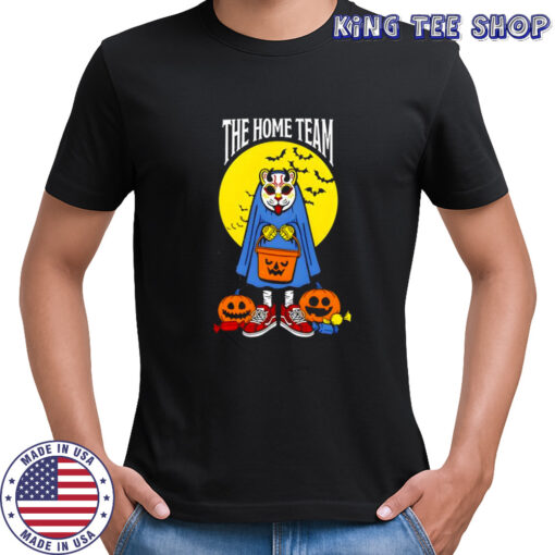 The color palette of this **Trick or Treat the home team Halloween shirt** is a rich blend of autumn hues, with deep oranges, midnight blacks, and ghostly whites coming together to create a visually striking ensemble. Whether you’re off to a neighborhood costume party, a hayride with friends, or just cozying up at home to hand out candy, this shirt is the perfect choice to showcase your festive flair. Embrace the nostalgia of childhood trick-or-treating, the thrill of cheering for your favorite team, and the joy of celebrating the spookiest night of the year all rolled into one stylish garment. Make this Halloween unforgettable with the perfect blend of spooky and sporty in every stitch.
